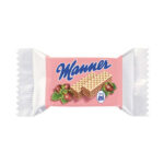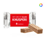 2 knusprige Manner Waffeln gefüllt mit Haselnusscreme (15 g, VEGAN) im Werbeschuber aus weißem Karton, individuell bedruckt. Haltbarkeit: mindestens 5 Monate. Mindestbestellmenge: 1.000 Stück.