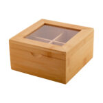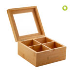 Nachhaltige Teeaufbewahrungsbox aus Bambus mit transparentem Glasdeckel und 4 Abteilen. Auf Anfrage liefern wir Ihnen die Box auch befüllt.