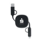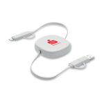 Einziehbares Ladekabel (60W) mit Gehäuse aus recyceltem ABS, auch in schwarz erhältlich. Eingang: 2in1 Typ-C und Typ-A. Ausgang: Typ-C und Mikro-B (2 in 1 Pin). Kabellänge: 80 cm.