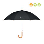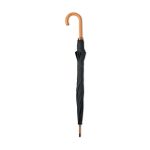 Großer Regenschirm aus 190T RPET Pongee. Stock, Spitzen und Krone aus Holz, Stangen aus schwarz überzogenem Metall. Gebogener, naturbelassener Griff aus Holz. Automatische Öffnung, manuelle Schließung. Aufdruck auf einem Segment.