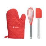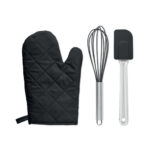 Backzubehör-Set bestehend aus einen Ofenhandschuh aus Polycotton (95% Polyester, 5% Baumwolle), einen Schneebesen und einen Teigspachtel aus Silikon. Set auch in schwarz erhältlich.
