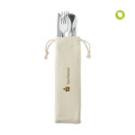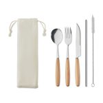 Wiederverwendbares Besteck-Set aus Edelstahl in nachhaltigem Säckchen aus Leinen. Das Set enthält ein Messer, eine Gabel, einen Löffel und einen Strohhalm aus Edelstahl sowie eine Bürste zum Reinigen.