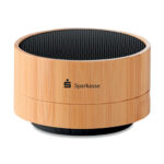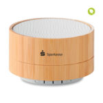 4.2 wireless Lautsprecher aus ABS mit Bambus-Dekor und beleuchteter Unterseite. Inklusive wieder aufladbarer Li-on 450 mAh Batterie und Mikro-USB-Kabel. Ausgangsleistung: 3W, 4 Ohm und 5V. Spielzeit: ca. 3 Stunden. In weiß oder schwarz mit Bambus-Dekor erhältlich, maximale Druckfläche: 2 x 1 cm.