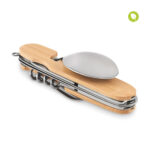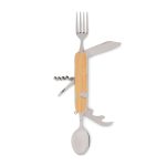 Camping Essbesteck aus Holz, in Form eines Taschenmessers, mit Löffel, Messer, Gabel und Korkenzieher.