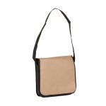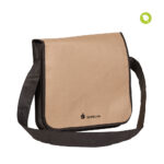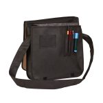 Umhängetasche mit Einsteckfächern für Schreibgeräte. Innenleben und Umhängegurt sind aus schwarzem Non-Woven. Der Überschlag und die Rückseite aus stabiler Papier-Rohfaser.