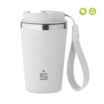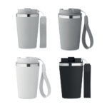 Auslaufsicherer Trinkbecher aus recyceltem Edelstahl mit Oberfläche aus recyceltem PP und RPET-Schlaufe für das Handgelenk. Füllmenge: 350 ml. In verschiedenen Farben erhältlich.