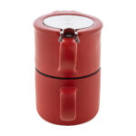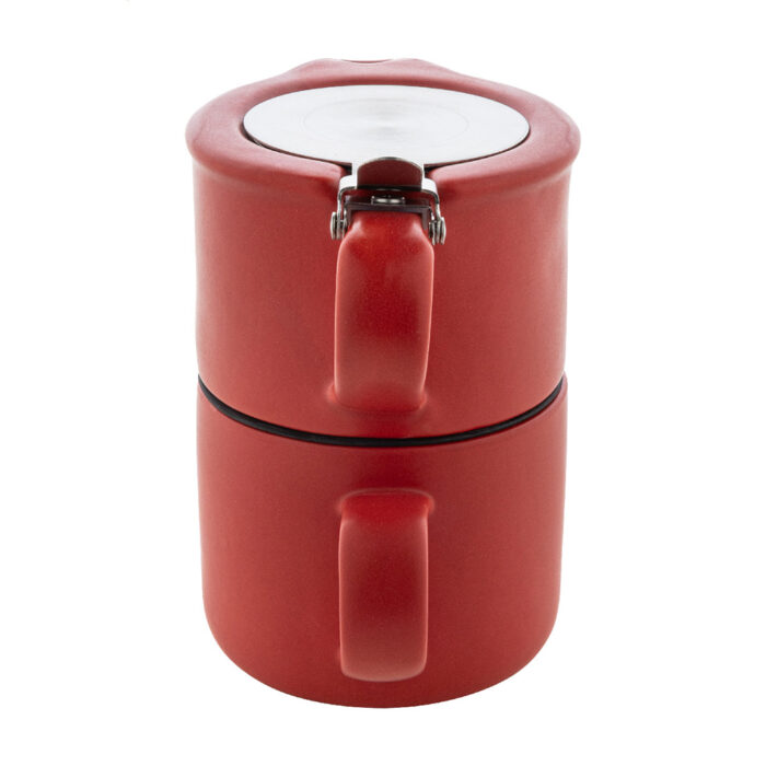 Hochwertiges Teeservice aus Keramik mit matter Oberfläche. Enthält eine Teekanne (430 ml) mit Edelstahldeckel und Teesieb, die sich perfekt auf die passende Tasse (400 ml) stapeln lässt. Einzeln in einer Kraftpapierbox.