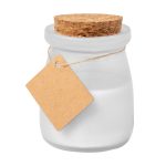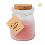 Schöne Duftkerze im gefrosteten Glas mit Korkdeckel. Erhältlich in zwei verschiedenen Sorten: Erdbeere (rot) und Vanille (weiß).