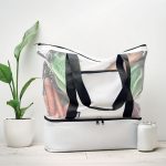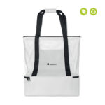 Halbtransparente Tragetasche mit langen Henkeln und Kühlfach im unteren Teil, abgetrennt mit einem Reißverschluss. In weiß oder schwarz erhältlich.