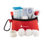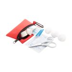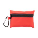 Kompaktes Erste-Hilfe-Set in Reißverschluss-Etui aus Nylon mit Karabiner. Beinhaltet: Schere, 1 Reinigungstuch, 1 Mullbinde, 3 Wattebäusche, 5 Pflaster und Klebeband.