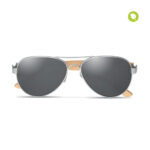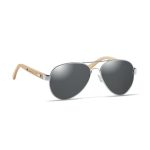 Coole Flieger-Sonnenbrille mit Bügeln aus Bambus und farbig verspiegelten Gläsern, UV400-Schutz. Die Brille wird in einem kleinen Beutel aus Microfaser geliefert. Farbton und Maße pro Artikel variieren.