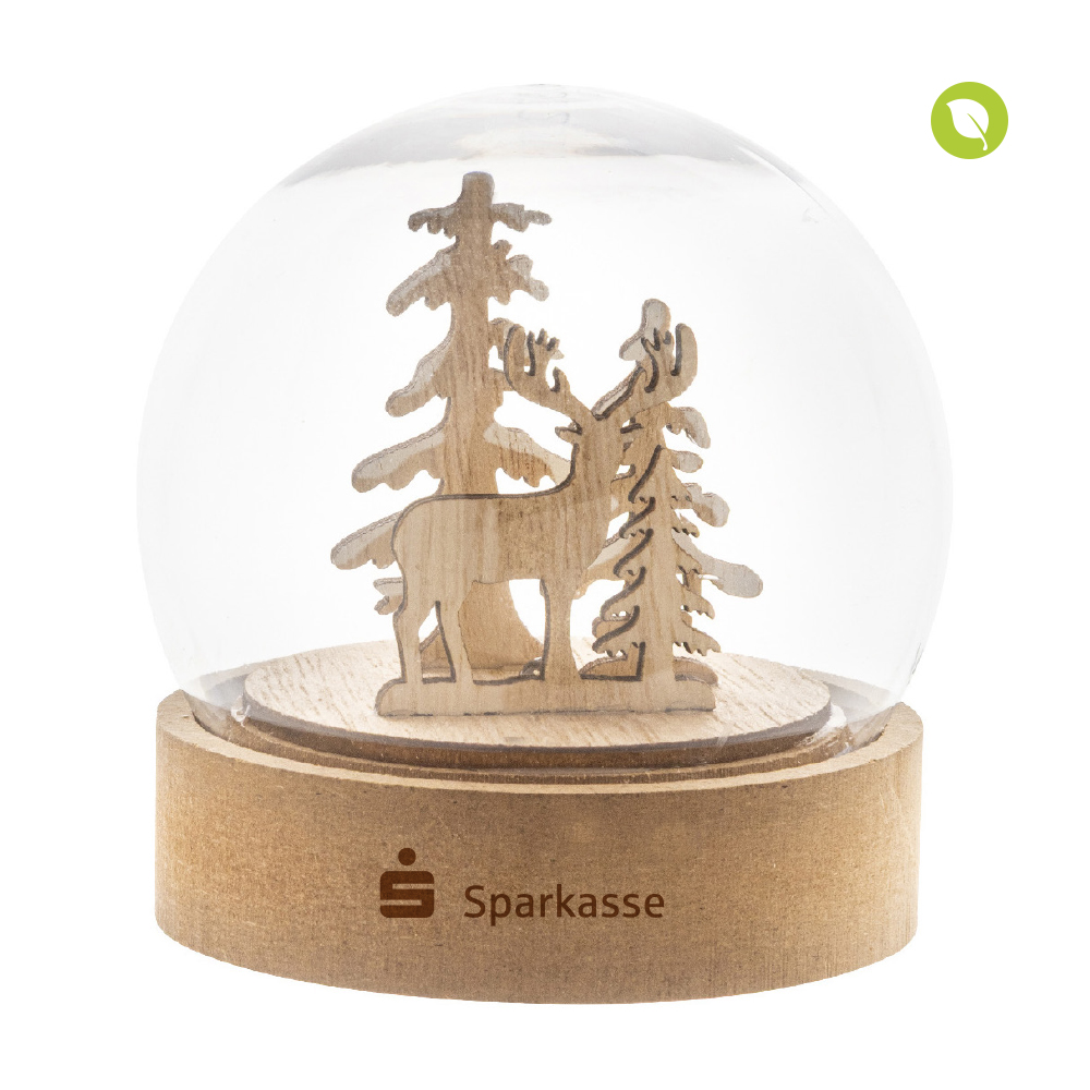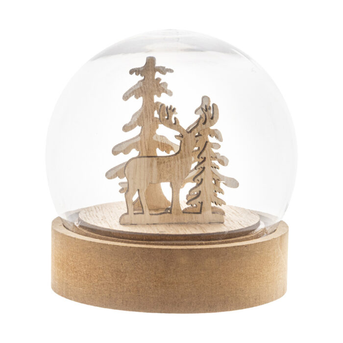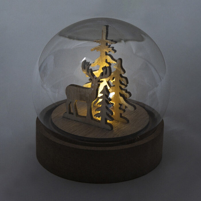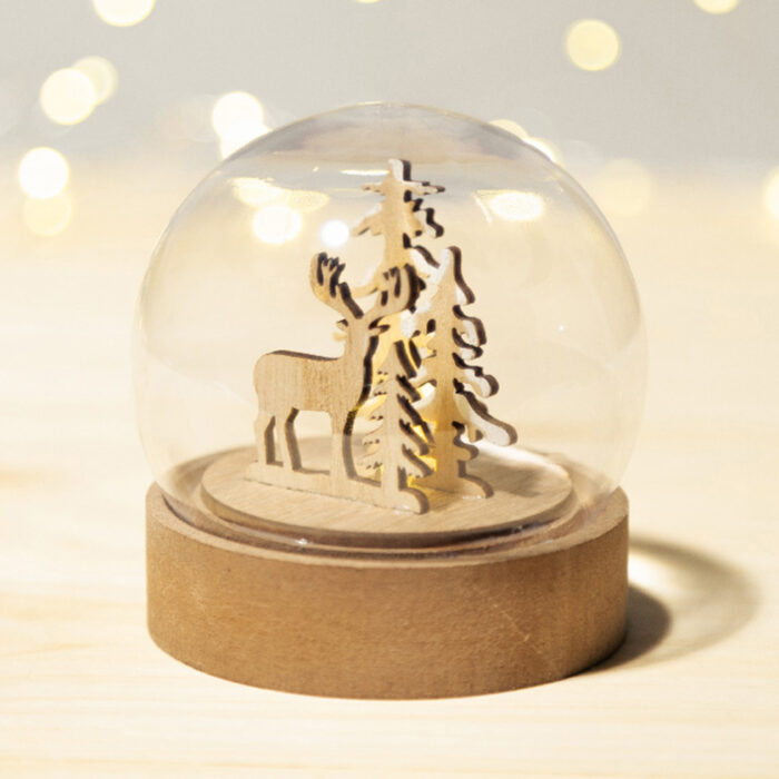 Beleuchtete Schneekugelform auf MDF-Holzsockel mit LED-Licht, Inklusive Knopfzellenbatterien. Mit Ein-/Ausschalter am Sockel.