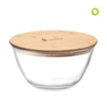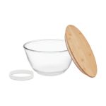 Schöne Glasschüssel mit Deckel aus Bambus und einem Silikon-Band zum sicheren Verschließen. Der Deckel verleiht der Schüssel einen natürlich schicken Look. Füllmenge: 1200 ml.
