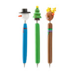 Holz-Kugelschreiber (blauschreibend) mit Weihnachtsfigur auf einer Feder. Verschiedene Figuren erhältlich: Schneemann, Tannenbaum, Rentier und Weihnachtsmann.