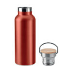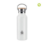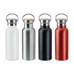 Doppelwandige Isolierflasche aus Edelstahl mit Deckel aus Bambus und Henkel. Füllmenge: 500 ml. Auslaufsicher. In vielen verschiedenen Farben erhältlich.