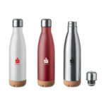 Doppelwandige Isolierflasche aus Edelstahl mit abgesetztem Boden aus Kork. Füllmenge: 500 ml. Auch in den Farben Weiß, Silber und Bordeaux erhältlich.