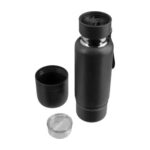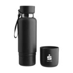 Doppelwandige Edelstahl-Vakuum-Trinkflasche (500 ml) mit einem abnehmbaren PP-Trinkbecher (300 ml) am Boden, Polyester-Handschlaufe und Tragegurt. Mattes Finish.