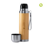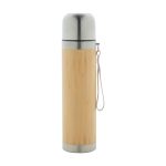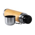Doppelwandige Vakuum-Isolierkanne aus Edelstahl mit Schnellverschluss, Trinkbecher, Handschlaufe und Bambusummantelung. Füllvermögen: 500 ml.