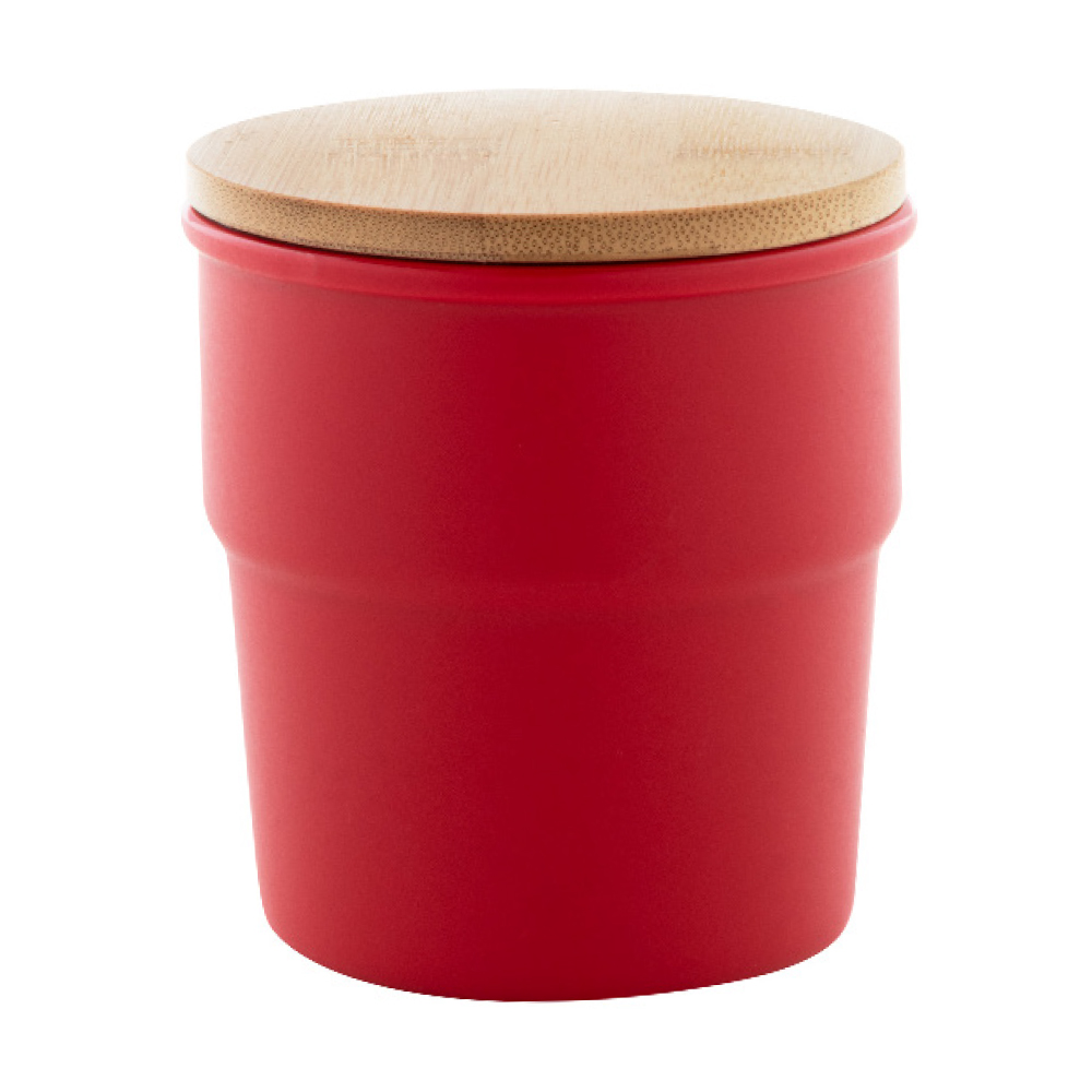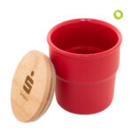 Hochwertige Keramiktasse mit Bambusdeckel, matter Außen- und glänzender Innenseite, in vielen verschiedenen Farben verfügbar. Füllmenge: 240 ml.