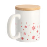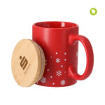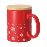 Winterlicher Keramiktasse mit Schneeflockenmotiv und Bambusdeckel, um schnelles Auskühlen zu vermeiden. Auch in weiß mit rotem Dekor erhältlich. Füllmenge: 300 ml.