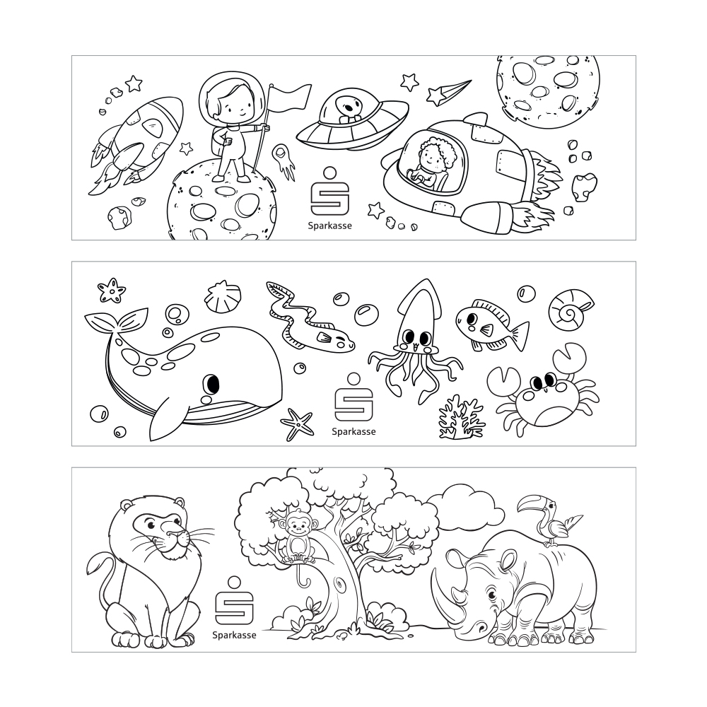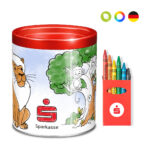 Runde Spardose aus 35 % recyceltem Kunststoff mit farbigem Deckel und Papiereinleger mit verschiedenen Motiven (Auswahl) zum Ausmalen – ideal zum Schulanfang oder Weltspartag! Deckel und Boden sind zu 100% recycelt, der Deckel ist mit dem Sparkassen-Signet (Blindprägung) versehen. Ein Set mit 6 Wachsmalstiften und der Einleger zum Ausmalen liegen separat bei, können aber auf Anfrage mit Aufpreis auch in der Dose konfektioniert geliefert werden. Motive: Weltraum, Meereslebewesen oder Savanne.