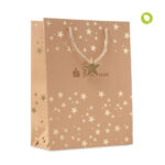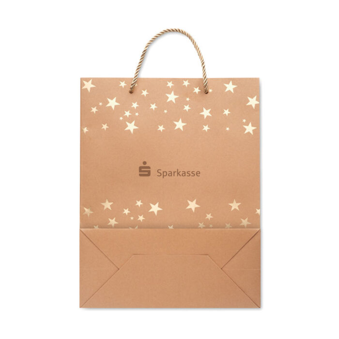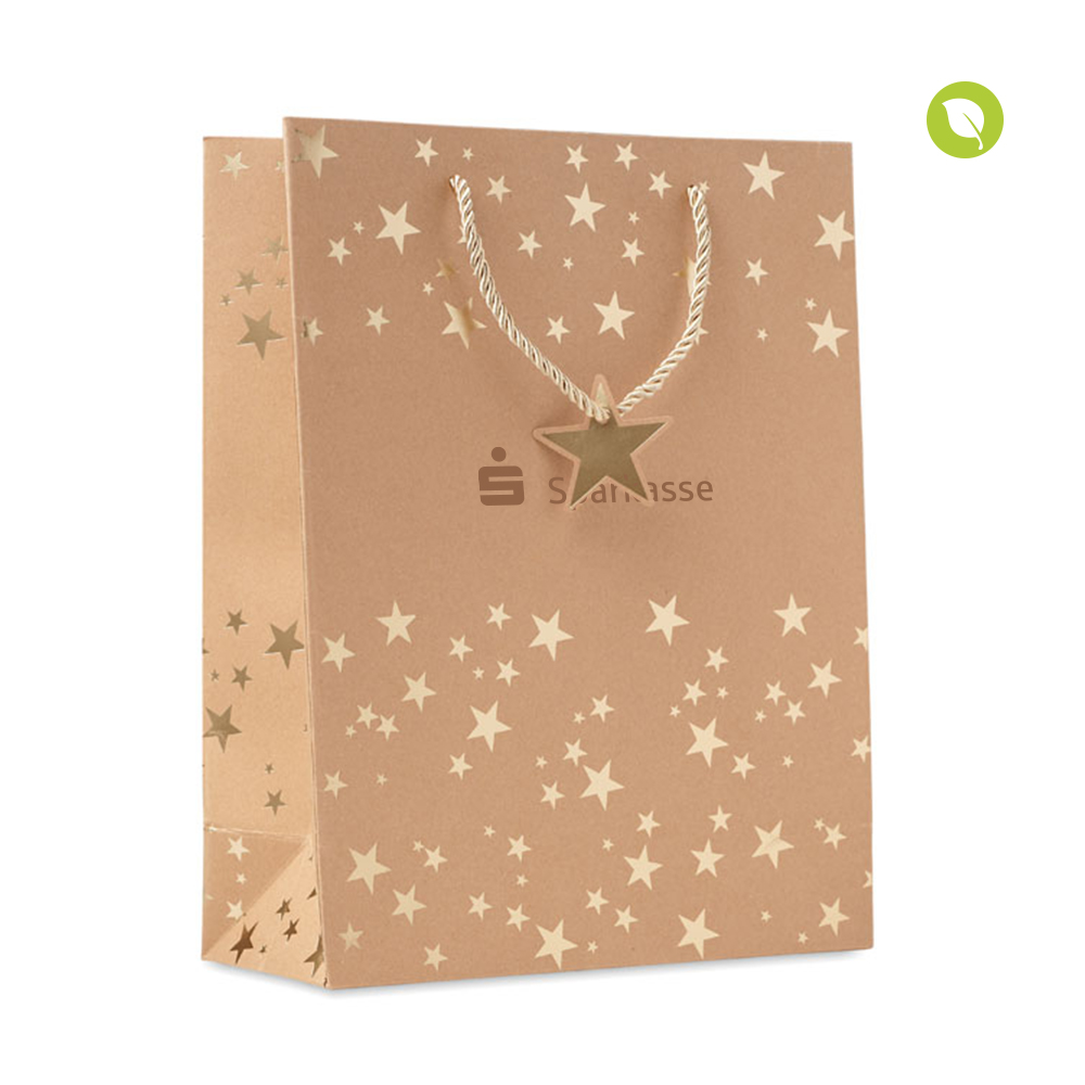 Elegante Geschenktüte aus Kraftpapier mit goldenen Sternen inklusive Geschenkanhänger. Material: 250 g/m² Kraftpapier, FSC®-zertifiziert.