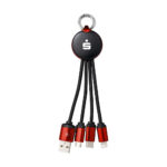 Modernes Multi-Ladekabel mit 6-Pin-Kabel für Geräte von Apple®, Micro USB und USB-C. Der per Laserdruck veredelte Bereich des Logos wird je nach Modell blau, rot oder weiß hinterleuchtet. In verschiedenen Farben erhältlich.