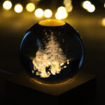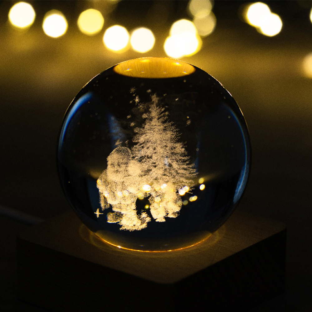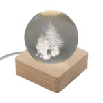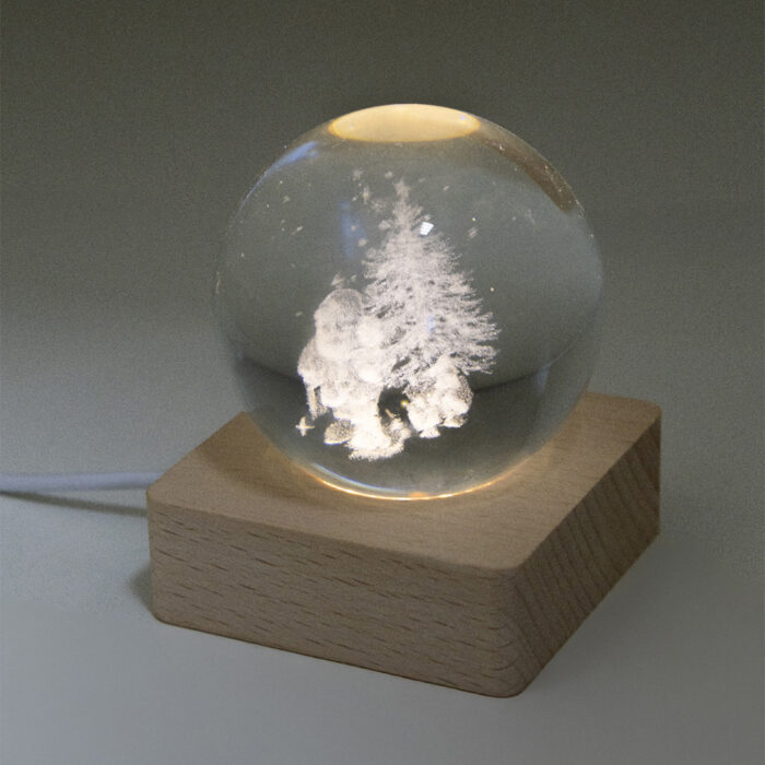 Kleine Glaskugel mit eingraviertem 3D-Weihnachtsmotiv und LED-Leuchtsockel aus Holz sowie USB-Ladekabel.