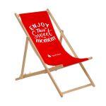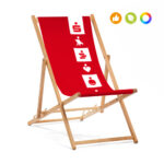 Liegestuhl mit verstellbarem Holzrahmen mit klarer Schutzlasur. Die Liegefläche ist individuell gestaltbar, 300g/m², abwischbar und waschbar. Maximale Tragfähigkeit: ca. 110 kg. In drei verschiedene Sitz- / Liegepositionen einstellbar.