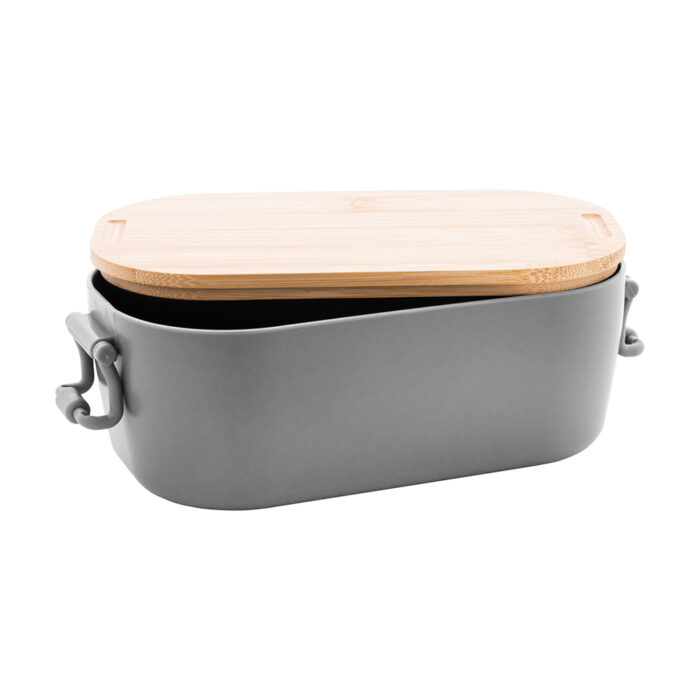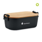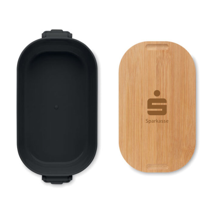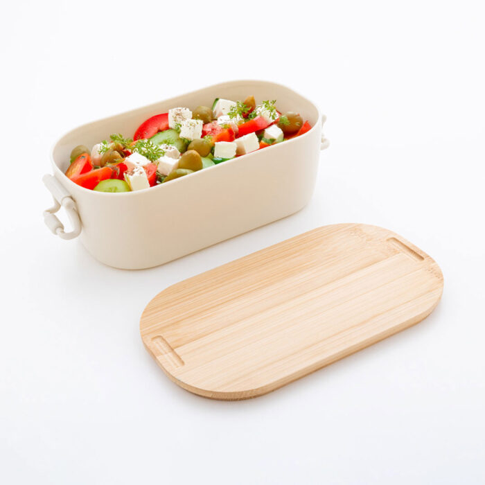 Formschöne Lunchbox aus PP-Kunststoff mit Bambusdeckel und Schnallen/Klammerverschluss. Füllmenge: 1000 ml. In verschiedenen Farben erhältlich.