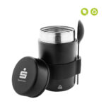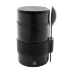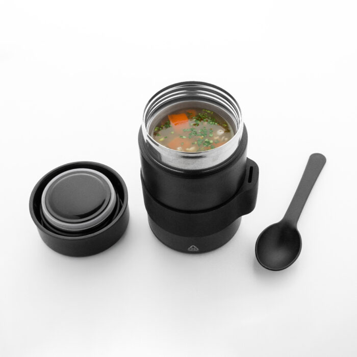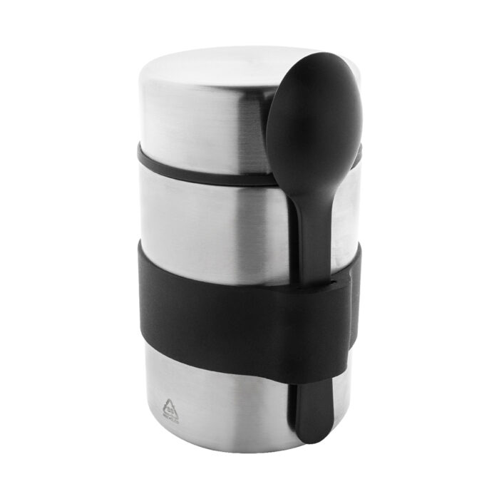 Doppelwandige Thermo-Lunchdose aus recyceltem Edelstahl mit Silikongriff und Löffel aus PP. Füllmenge: 450 ml.