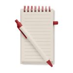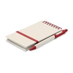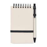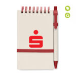 DIN A6 Notizbuch mit 70 Blatt (140 Seiten) aus 70% recyceltem Milchkarton und 30% recyceltem Papier. Spiralbindung, elastisches Verschlussband, Stiftschlaufe und passender Druckkugelschreiber (blaue Tinte). Erhältlich mit schwarzen oder roten Elementen.
