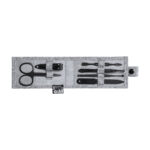Nachhaltiges, 6-teiliges Maniküre-Set mit Schere, Nagelknipser, Nagelfeile, Pinzette und 2 Nagelhautentfernern aus Edelstahl in Etui aus RPET Filz.