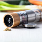 Hochwertige Salz- und Pfeffermühle mit 2 Seiten zum Befüllen und Keramikmahlwerk, aus Edelstahl und Bambus.