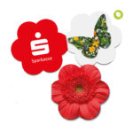 Individuell bedrucktes, flaches Klappkärtchen in Form einer Blume mit aufgeklebtem Samenpapier (Bienchen, Schmetterling oder Blümchen). Gewicht ca. 4 g – optimal auch als Beileger für den Briefversand!