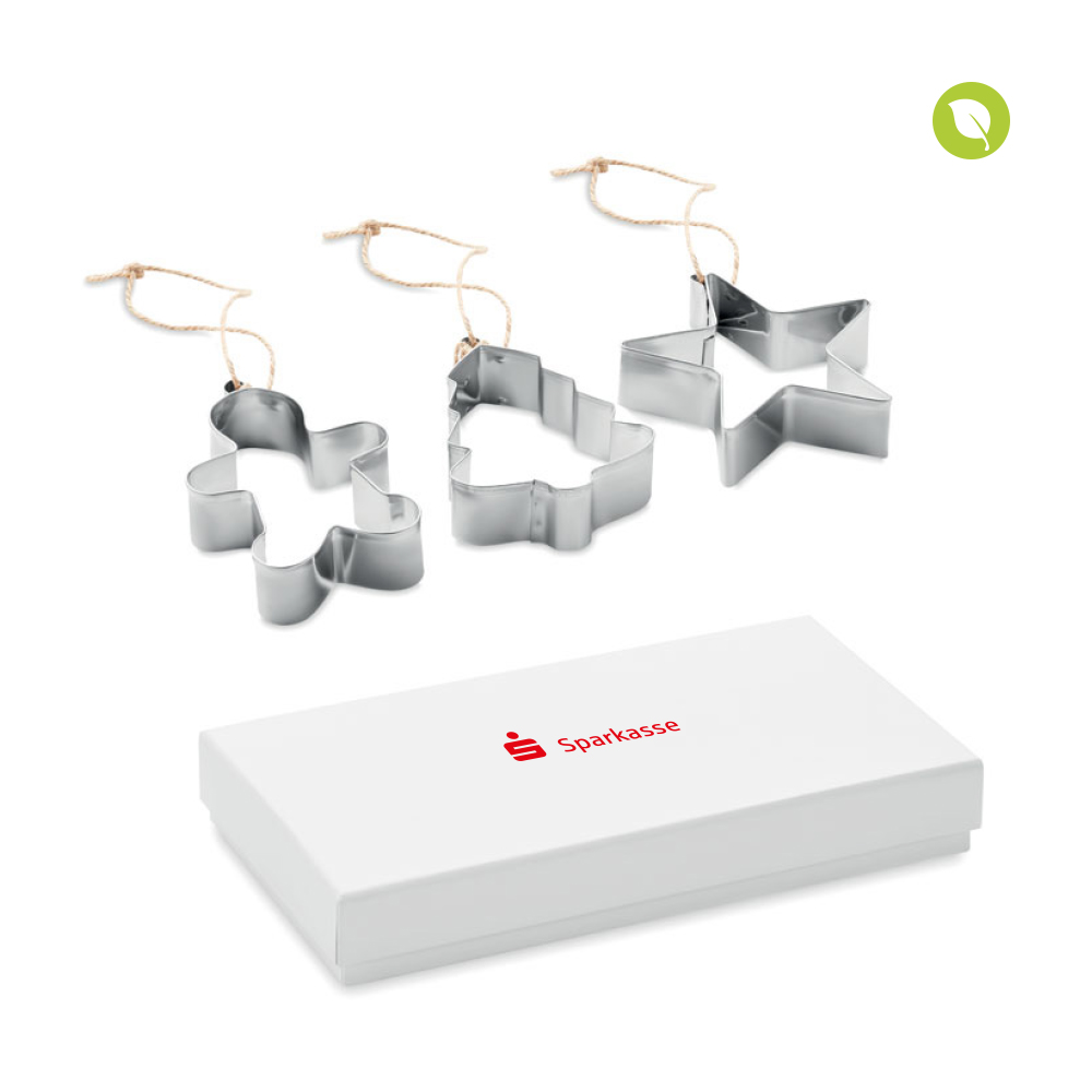Set mit 3 Ausstechförmchen aus Edelstahl. Mit Aufhänger aus Jutekordel, ideal auch als Weihnachtsbaumschmuck. Veredlung mittels Etikett auf der Umverpackung.