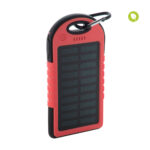 Outdoor-Powerbank aus Kunststoff mit Silikonmantel, Solar-Ladefunktion und einer LED Lampe. Kapazität: 4000 mAh. Inklusive USB-Ladekabel mit Micro-USB-Stecker.
