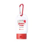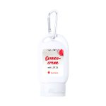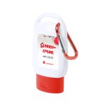 Sonnencreme LSF 30 im Kunststoffbehälter mit farblich abgestimmtem Deckel und Karabiner. Die Flasche wird mit einem Etikett versehen.Erhältlich in den Farben weiß und rot.