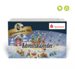 Adventskalender zum Aufklappen der Marke Goldmännchen mit 24+1 verschiedenen Teesorten (nicht aromatisiert/aromatisiert) zum Beispiel: Winterparadies, C-Früchtchen, Beerenschlitten, Ingwer-Lemon, Kräuterparty und Chai Schwarztee-Vaniller. Motiv/Inhalt wechselt jährlich, Saisonware.
