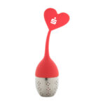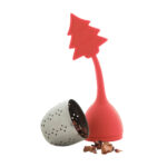 Tee-Sieb/Teefilter aus Edelstahl und Silikon mit Deko-Element „Tannenbaum“ oder „Herz“ auf der Spitze, welches aus der Tasse hervorragt.