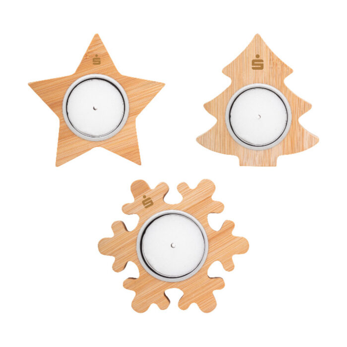 Weihnachtskerzenhalter aus Bambus mit Vanilleduft-Teelicht aus Pflanzenwachs, verschiedene Formen: Tannenbaum, Stern oder Schneeflocke. Brenndauer Teelicht: 4 Stunden.