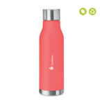 Trinkflasche aus RPET mit gummiertem Finish und Verschluss aus Edelstahl mit PRET im Inneren und Silikon-Dichtring. BPA-frei, auslaufsicher. Füllmenge: 600 ml
