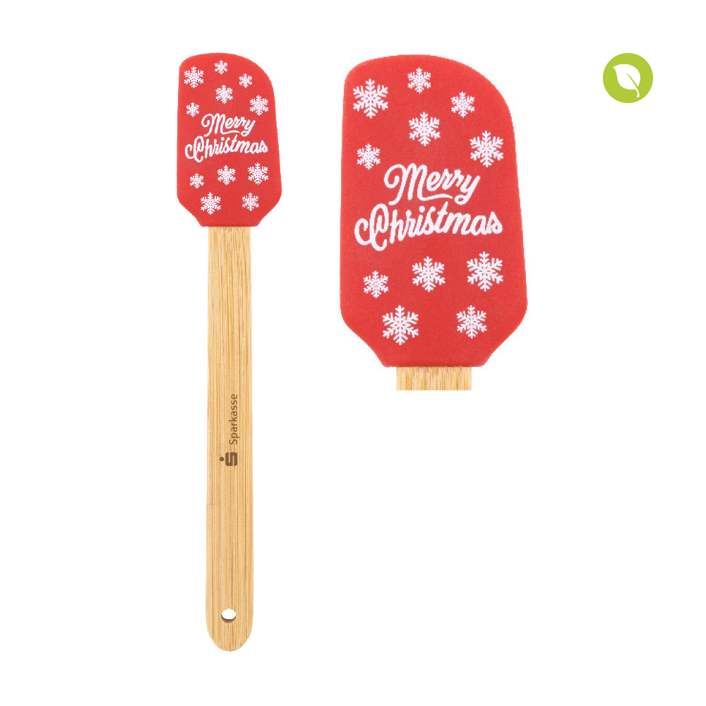 Schöner Backspatel aus Silikon mit weihnachtlichem Motiv und Bambusgriff.