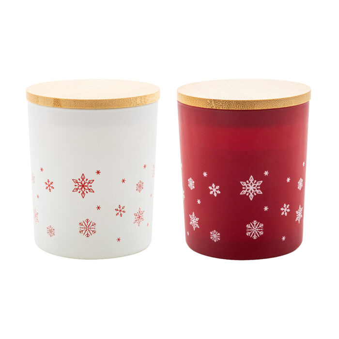 Duftende Wachskerze (120 g) auf pflanzlicher Basis in verschiedenen Duftnoten (grün = Tannennadel, rot = Zimt, weiß = Vanille) in einem mattierten Glas mit weihnachtlichem Motiv und Bambusdeckel.