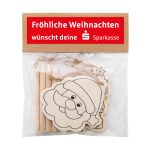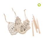 Niedlicher Weihnachtschmuck in drei verschiedenen Motiven (Weihnachtsmann, Weihnachtsbaum und Schneemann) und 4 Buntstiften zum Anmalen. Mit Hanfschnur zum Aufhängen. Die Veredlung erfolgt mittels Etikett auf der Umverpackung.